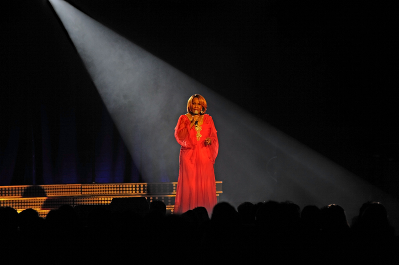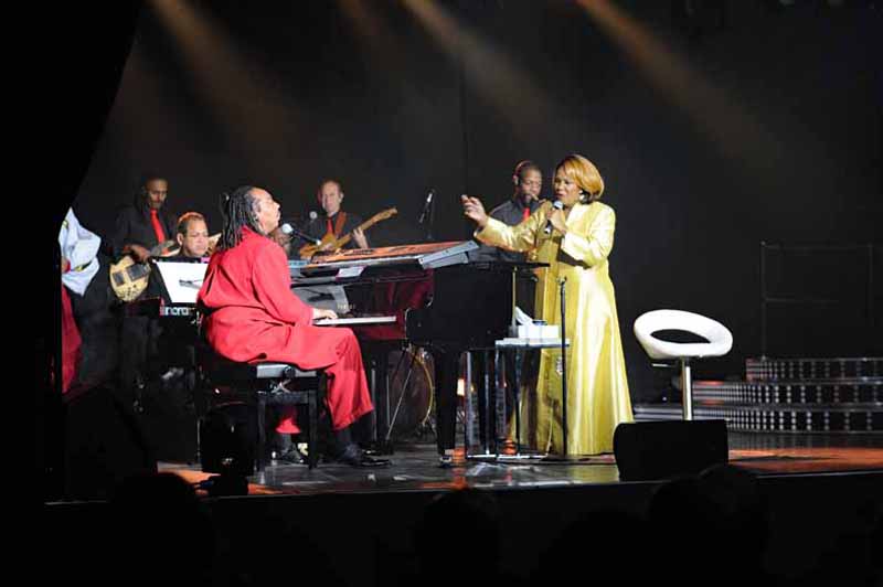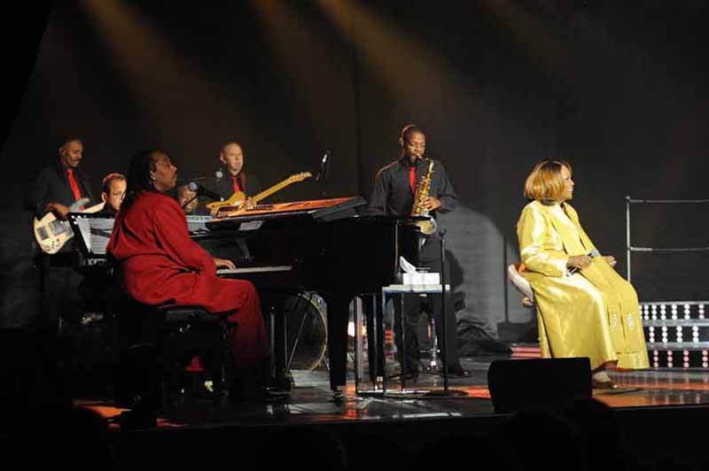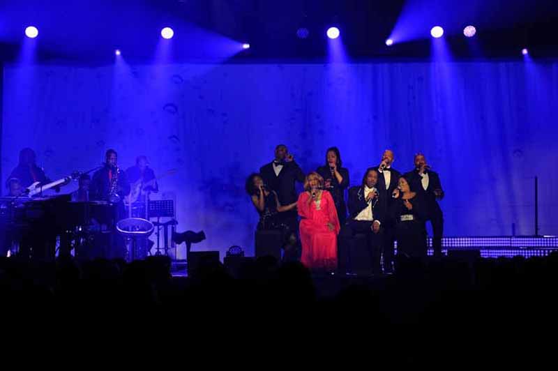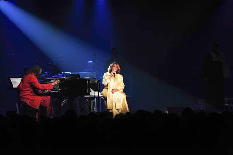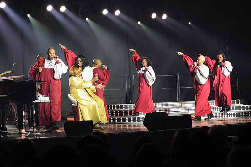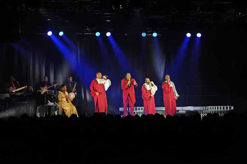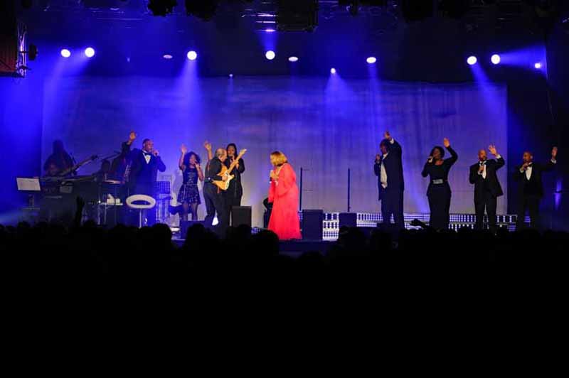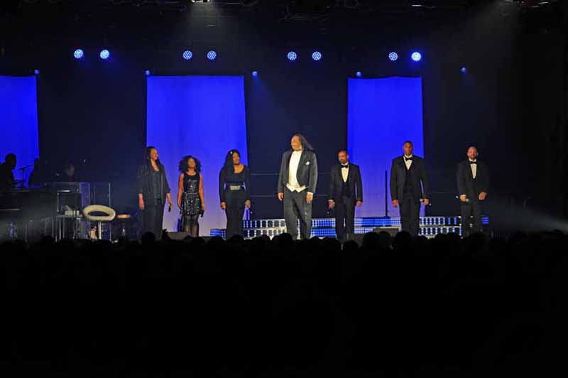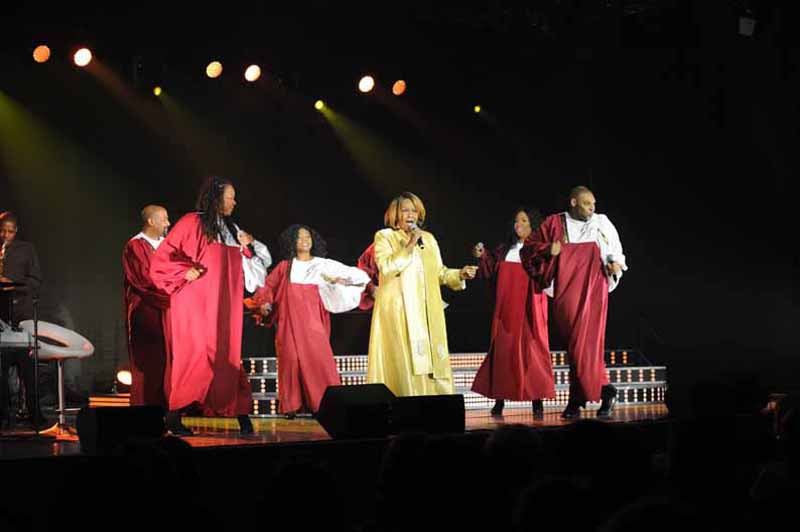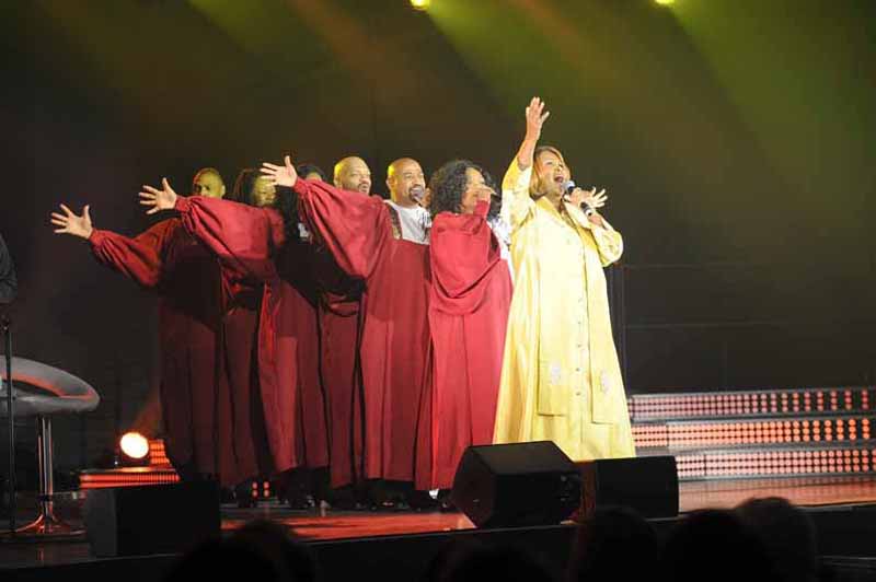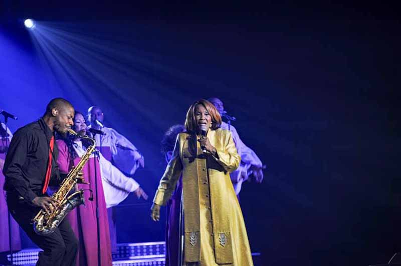 Sie beherrscht natürlich immer noch mit ihrer Präsents und ihrer Stimme die Bühne und daran gibt es keinen Zweifel. Die Bühnenchoreografie ist aber auch so ausgelegt, dass sie in die Reihen der Harlem Gospel Singers mit eingebunden ist.