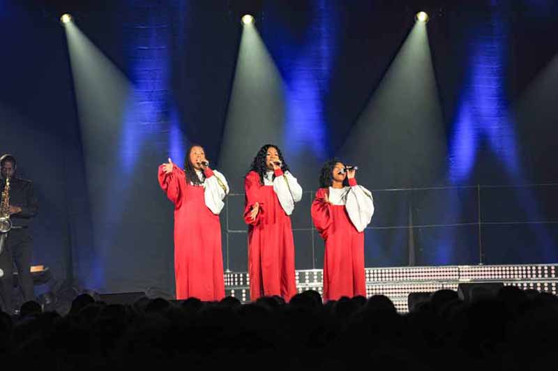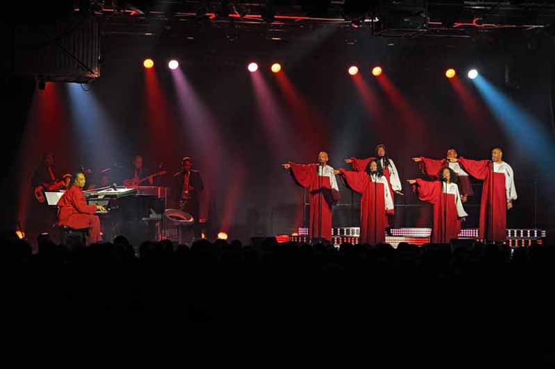 Etliche Scheinwerfer mehr waren an den Traversen im Kulturwerk installiert worden, um die Show der Harlem Gospel Singers mit Queen Esther Marrow im rechten Rampenlicht erscheinen zu lassen. Eine Show, die so nicht alle Tage über die Kulturwerksbühne in Wissen geht. Eine absolut durchgetaktete Show mit einer ausgefeilten Choreografie.